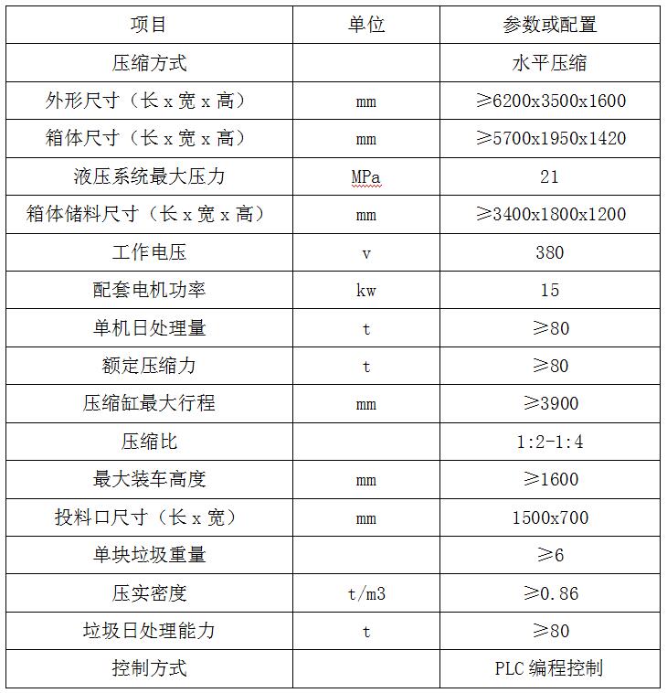 全封閉水平壓縮:采用水平壓縮方式,垃圾壓縮密度≥0.86t/m3,垃圾壓縮后體積大大減小,從而大幅度提高轉運車輛裝載量和轉運效率,降低垃圾處理、轉運等費用;